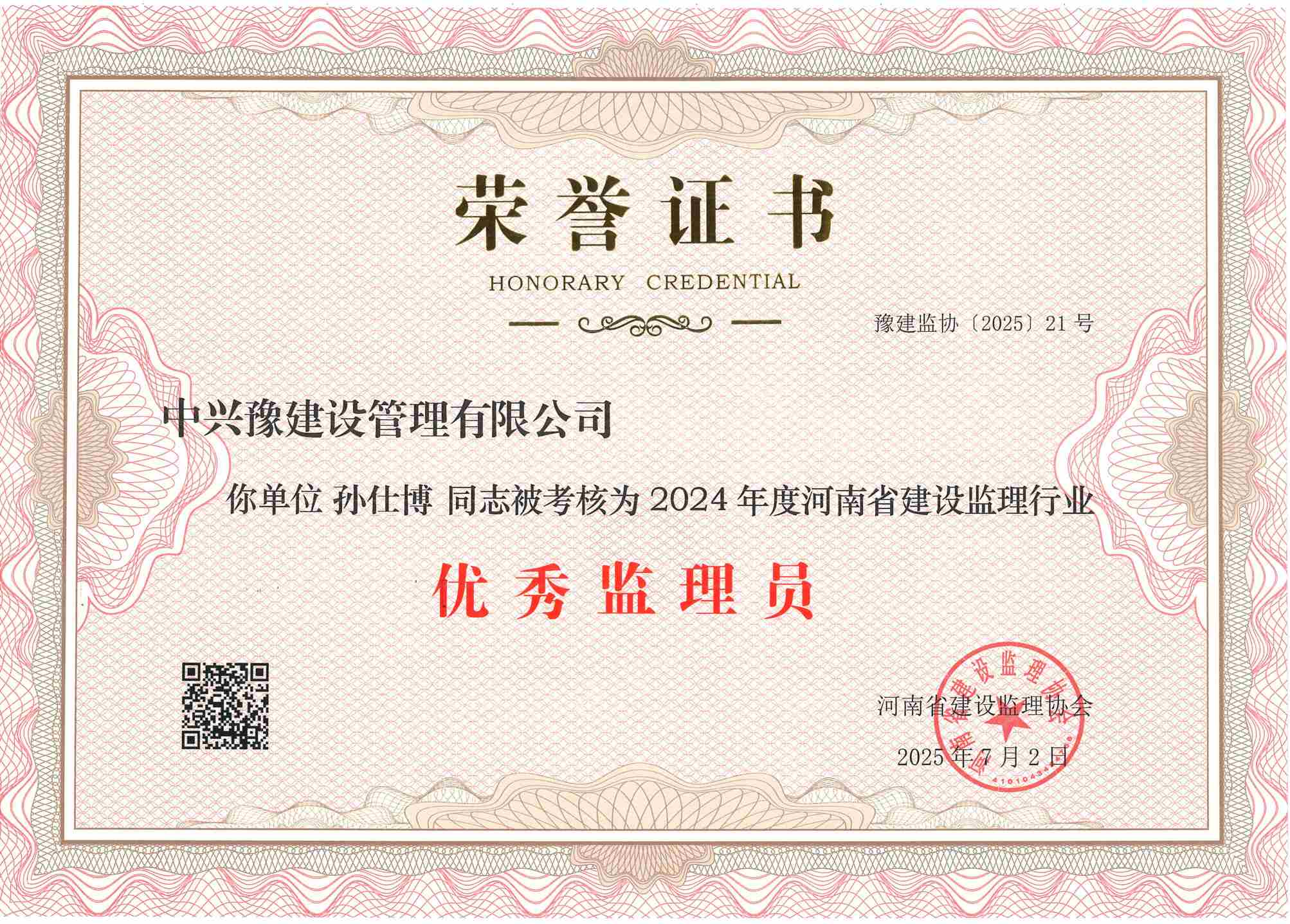 陳霄、范昂、呂怡秒、孫仕博、袁俊發(fā)、張俊偉、張世民 7位同志榮獲“優(yōu)秀監(jiān)理員”稱號(hào)