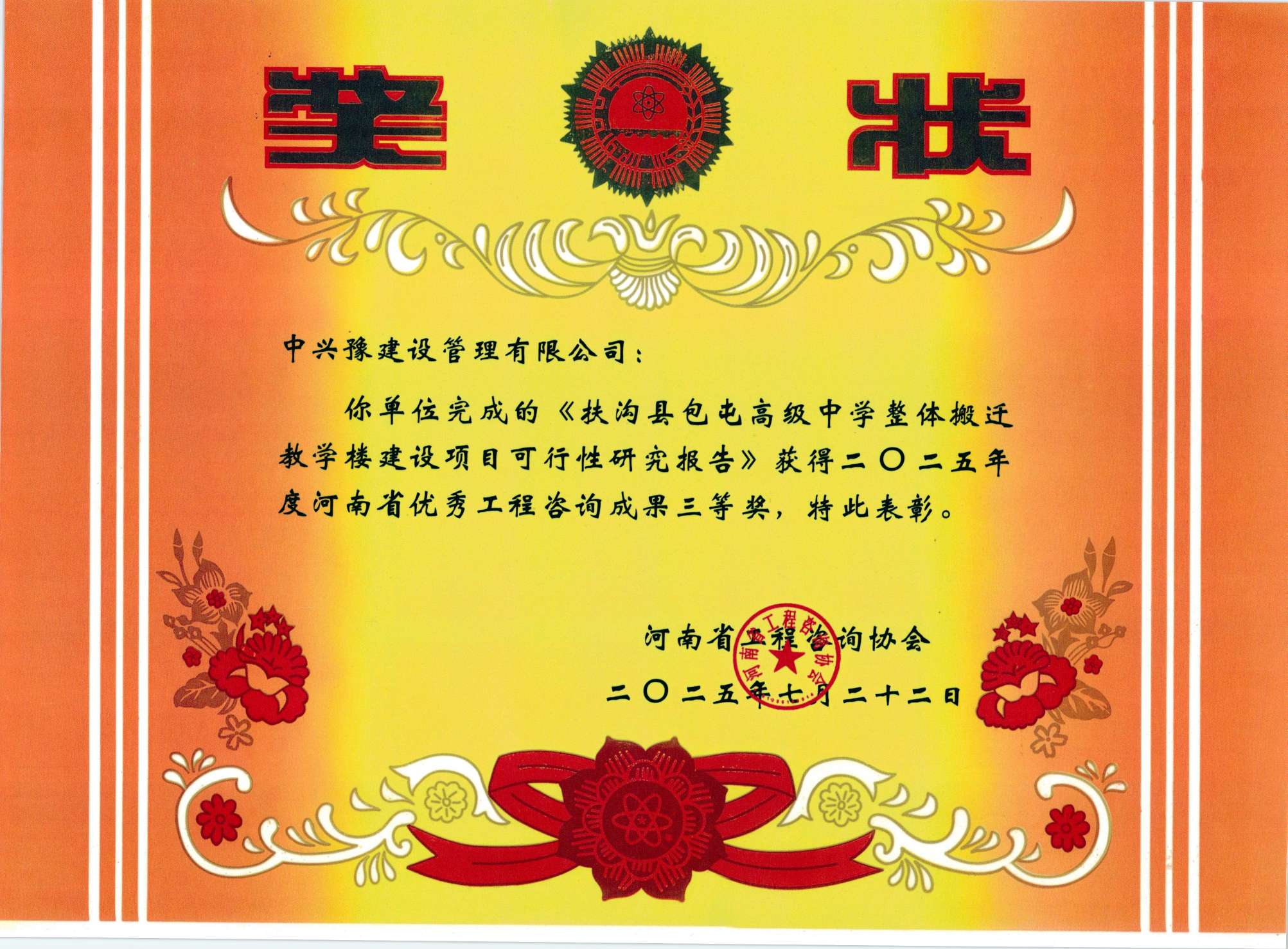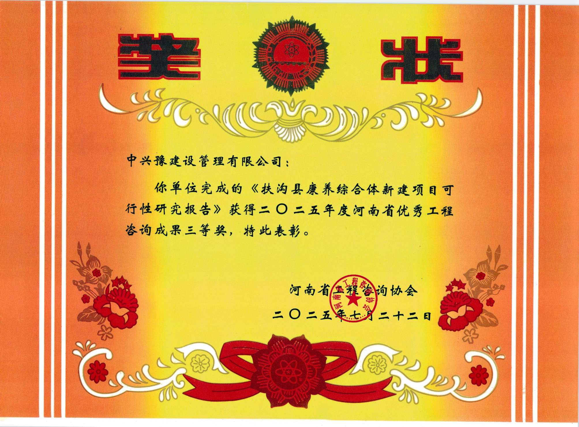 近日,河南省工程咨詢協(xié)會(huì)發(fā)布了《關(guān)于公布2025年度河南省優(yōu)秀工程咨詢成果獎(jiǎng)獲獎(jiǎng)項(xiàng)目的通知》(豫咨協(xié)〔2025〕03號(hào)),中興豫建設(shè)管理咨詢有限公司榮獲一等獎(jiǎng)一項(xiàng),二等獎(jiǎng)一項(xiàng),三等獎(jiǎng)三項(xiàng)殊榮。其中,《平橋區(qū)2023年老舊小區(qū)改造項(xiàng)目可行性研究報(bào)告》獲得一等獎(jiǎng);《扶溝縣金輝機(jī)械裝配產(chǎn)業(yè)園建設(shè)項(xiàng)目可行性研究報(bào)告》獲得二等獎(jiǎng)?!斗鰷峡h康養(yǎng)綜合體新建項(xiàng)目可行性研究報(bào)告》《信陽(yáng)市平橋區(qū)茶產(chǎn)業(yè)融合發(fā)展示范園建設(shè)項(xiàng)目可行性研究報(bào)告》《扶溝縣包屯高級(jí)中學(xué)整體搬遷教學(xué)樓建設(shè)項(xiàng)目可行性研究報(bào)告》獲得三等獎(jiǎng)。